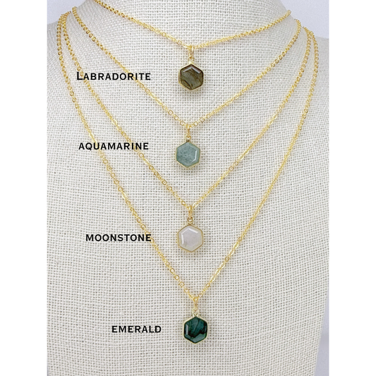 Hexagon Moonstone, Labradorite, Emerald, Aquamarine Necklace: 16K Gold Plated Pendant, June Birthstone