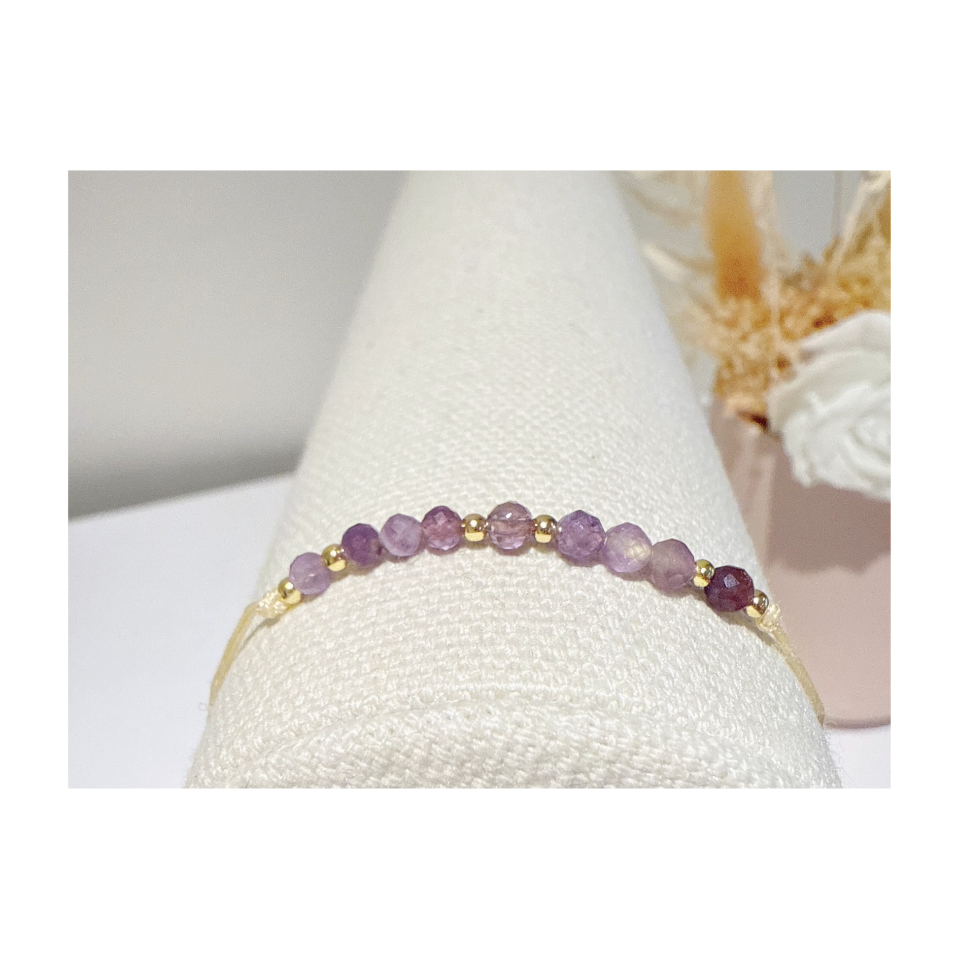 The amethyst gemstones are the prettiest purple hues. Feminine with the tiny gold accent beads, eye catching, and matches the neutral string perfectly. It looks great layered with a gold chain bracelet (with no jagged edges) or perfect on its own.