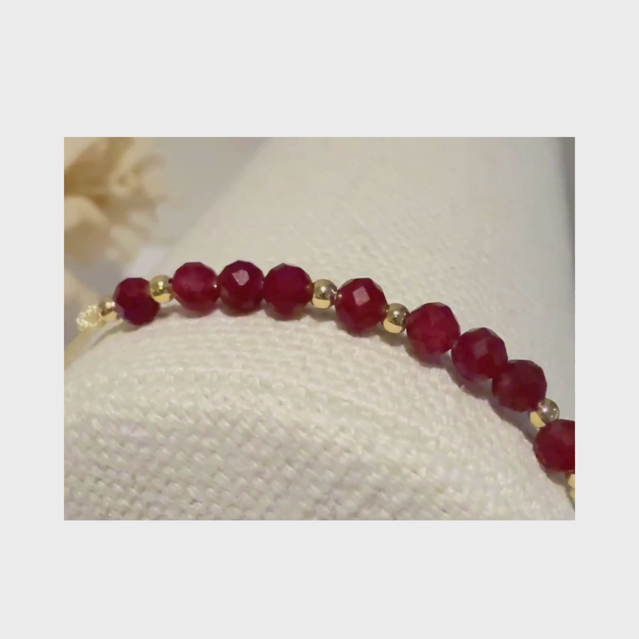 This dainty yet sturdy bracelet features genuine round, faceted Ruby gemstones. Celebrate the bold spirit of July with this radiant ruby gemstone bracelet. Known as the birthstone of July, ruby symbolizes passion, vitality, and the unshakable strength of the heart.